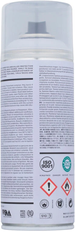 Advertencia del fabricante:Temperatura ambiente óptima durante la pulverización: 20-25°C. No usar el Spray.Bike a temperaturas exteriores por debajo de 10°C, por encima de 35°C o con una humedad relativa de más del 75%. Mantener la lata bien protegida de la luz solar y de temperatura ambiental superior a 50°C/122°F.Caracterización según normativa CLP: