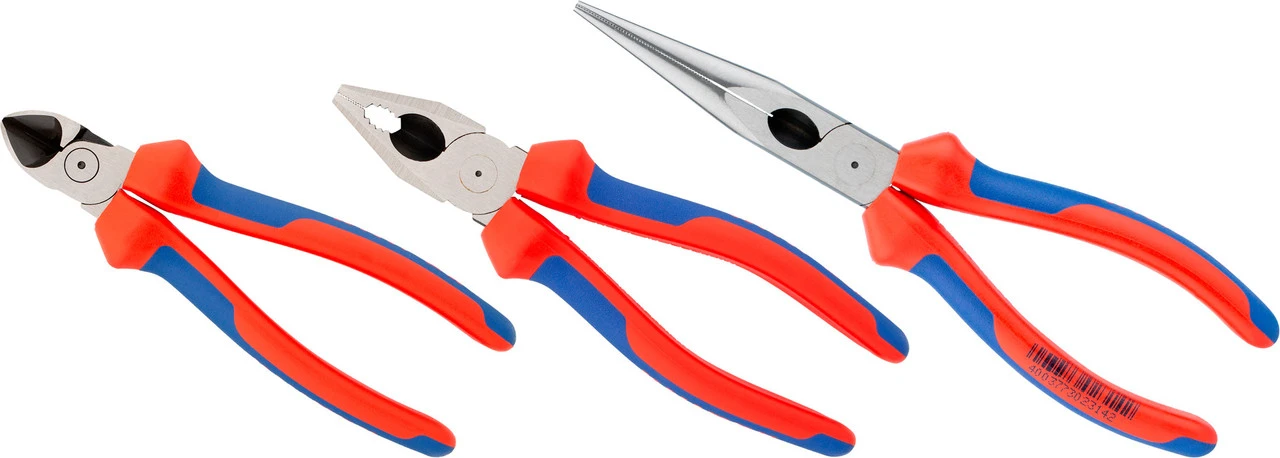 El set de alicates de Knipex consta de alicates universales, corte diagonal y de punta redonda plana con filo de corte.