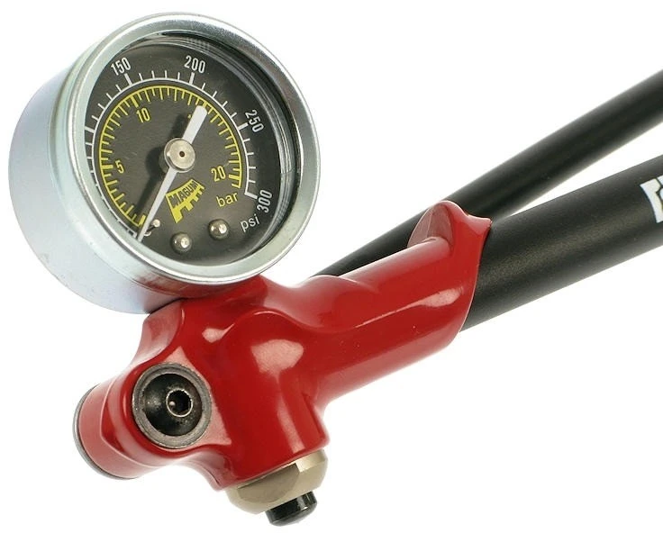La bomba de amortiguador de Magura permite bombear hasta 20 bares y, gracias a la válvula especial, sin pérdida de aire. Un manómetro de fácil lectura te informa en todo momento del valor actual en bar o psi.