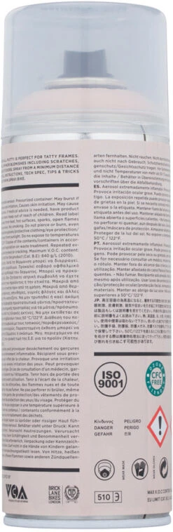 Advertencia del fabricante:Temperatura ambiente óptima durante la pulverización: 20-25°C. No usar el Spray.Bike a temperaturas exteriores por debajo de 10°C, por encima de 35°C o con una humedad relativa de más del 75%. Mantener la lata bien protegida de la luz solar y de temperatura ambiental superior a 50°C/122°F.Caracterización según normativa CLP: