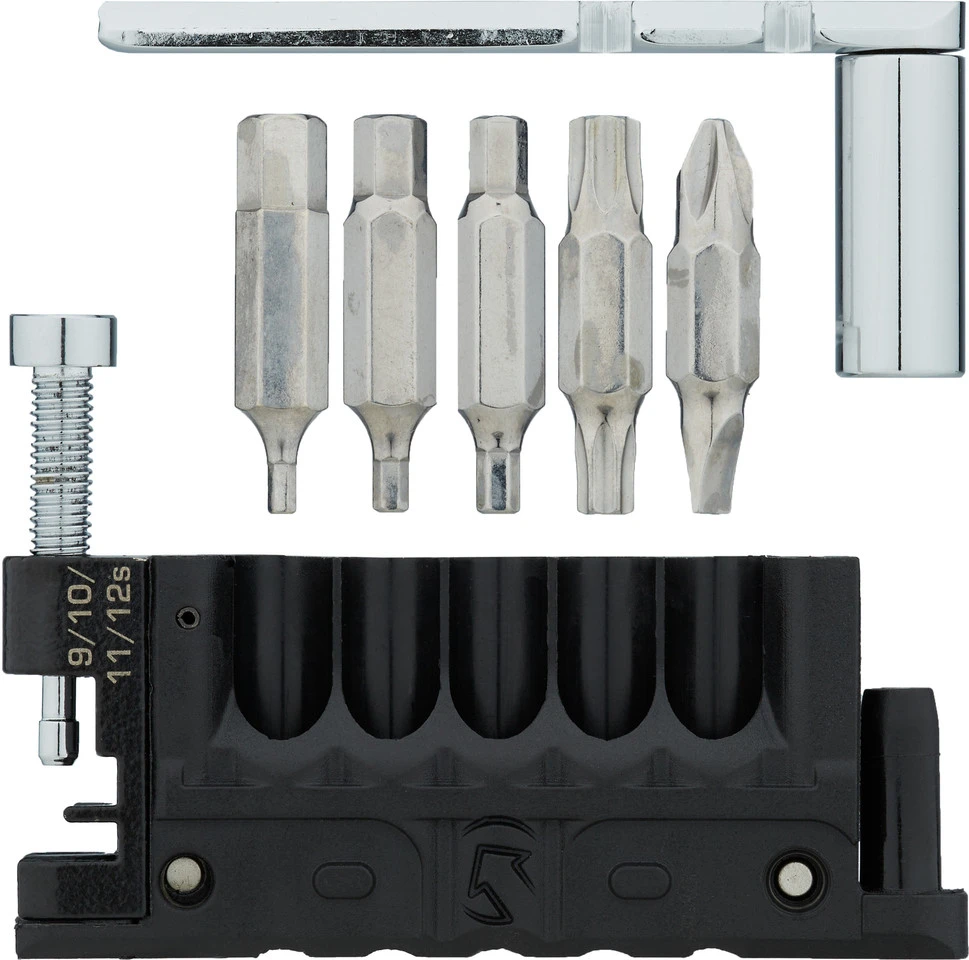 La Performance 17 Minitool de PRO te ofrece 17 funciones en una sola herramienta compacta. Está equipado con varias llaves hexagonales y de Torx, destornilladores y varios tensores de cabecillas. Se incluye además un tronchacadenas de 9 a 12 velocidades, así como una llave de válvula. También con espacio para un eslabón de cadena de repuesto y una práctica palanca en la que puedes fijar las puntas.