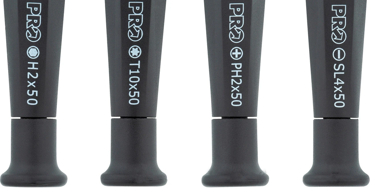 El juego de destornilladores de 4 piezas PRO Fine Adjustment ayuda en los trabajos que requieren una precisión especial, como el ajuste fino del sistema de cambios. Incluye un destornillador hexagonal, uno de torsión, uno plano y uno de estrella.