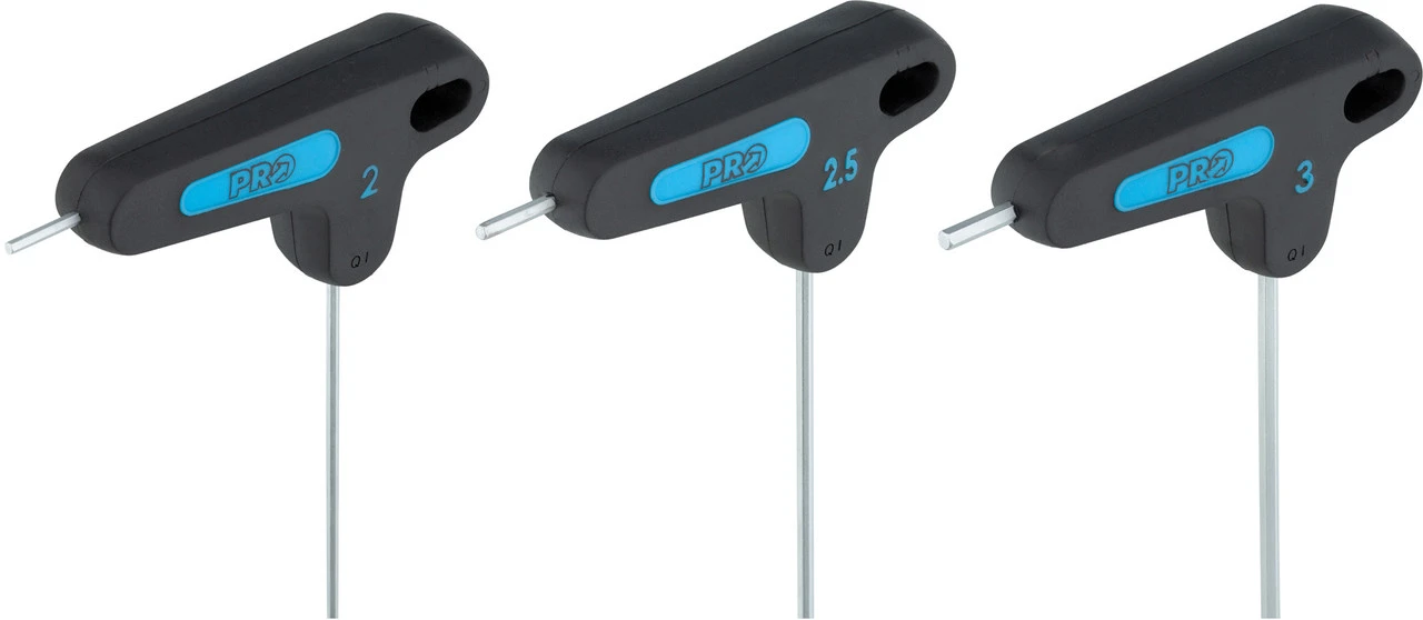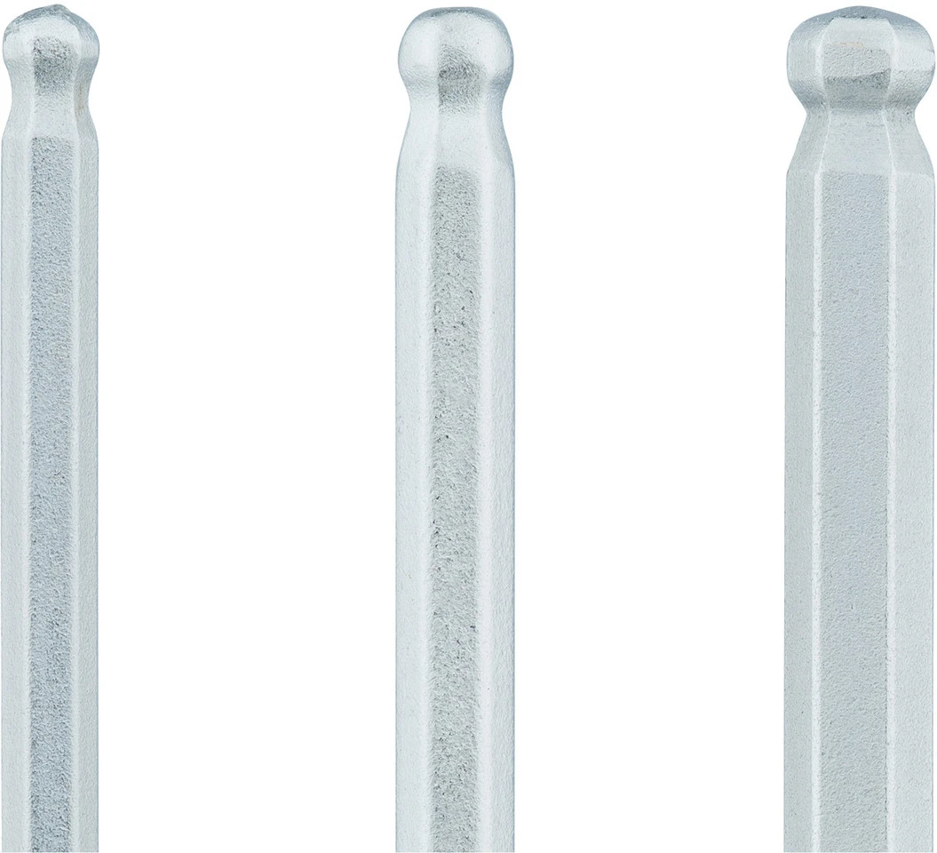 El set de llaves hexagonales PRO de tres piezas con cabeza esférica en tamaños de 2, 2,5 y 3 mm está fabricado de acero robusto y recubierto de cromo.