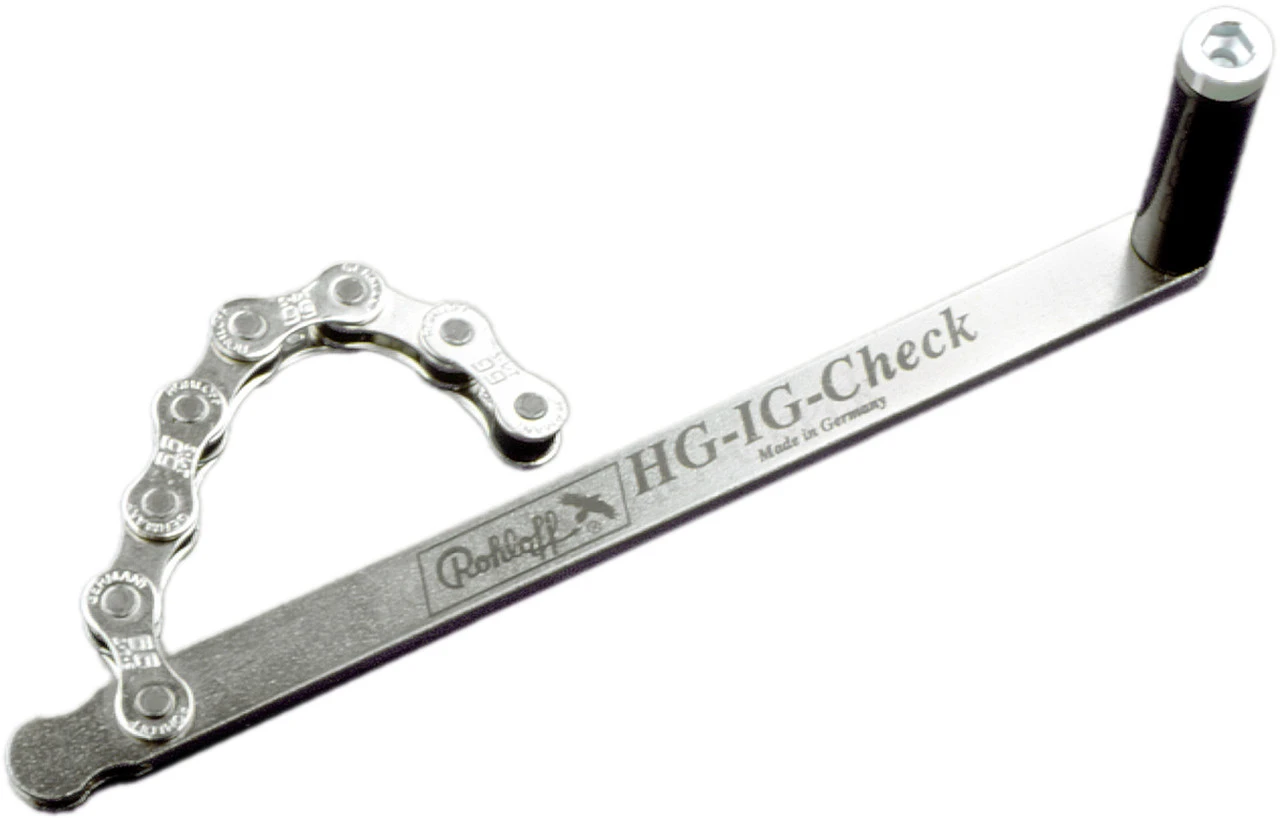 Una comprobación con el Rohloff HG-Check te informa de forma rápida y fiable sobre el estado de desgaste de tus piñones Shimano Hyperglide. La prueba debe realizarse antes de las salidas largas en bicicleta, pero sobre todo antes de las carreras de ruta o de MTB, para no verse sorprendido de repente por una cadena que salta.