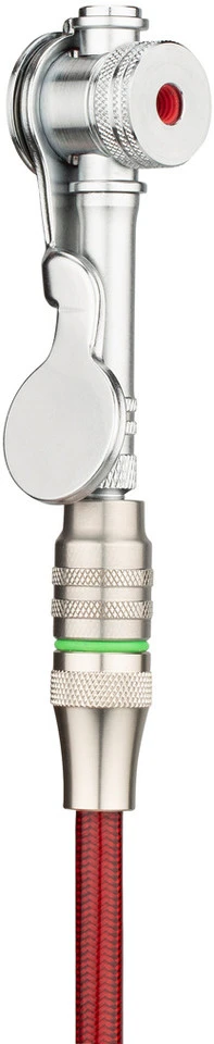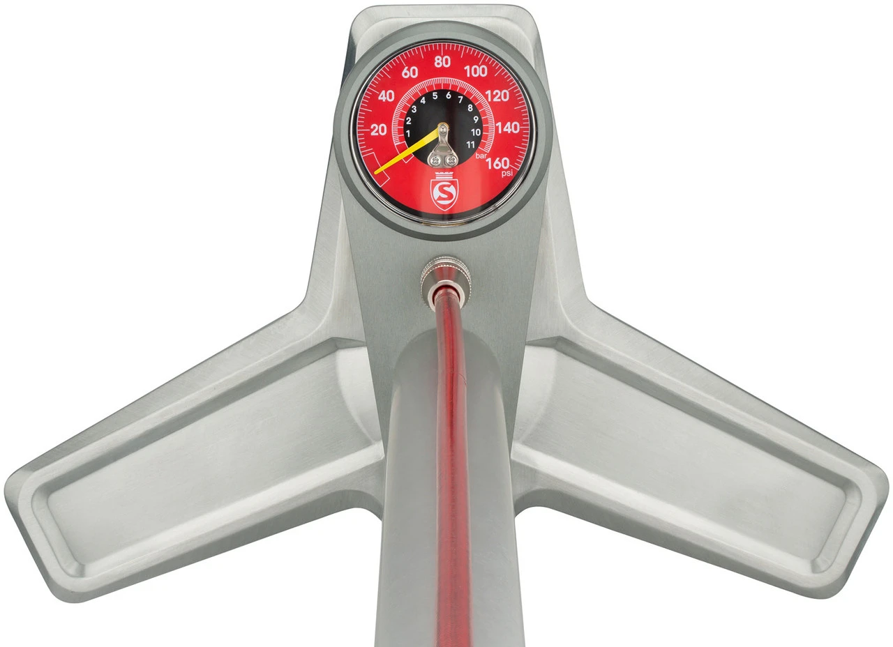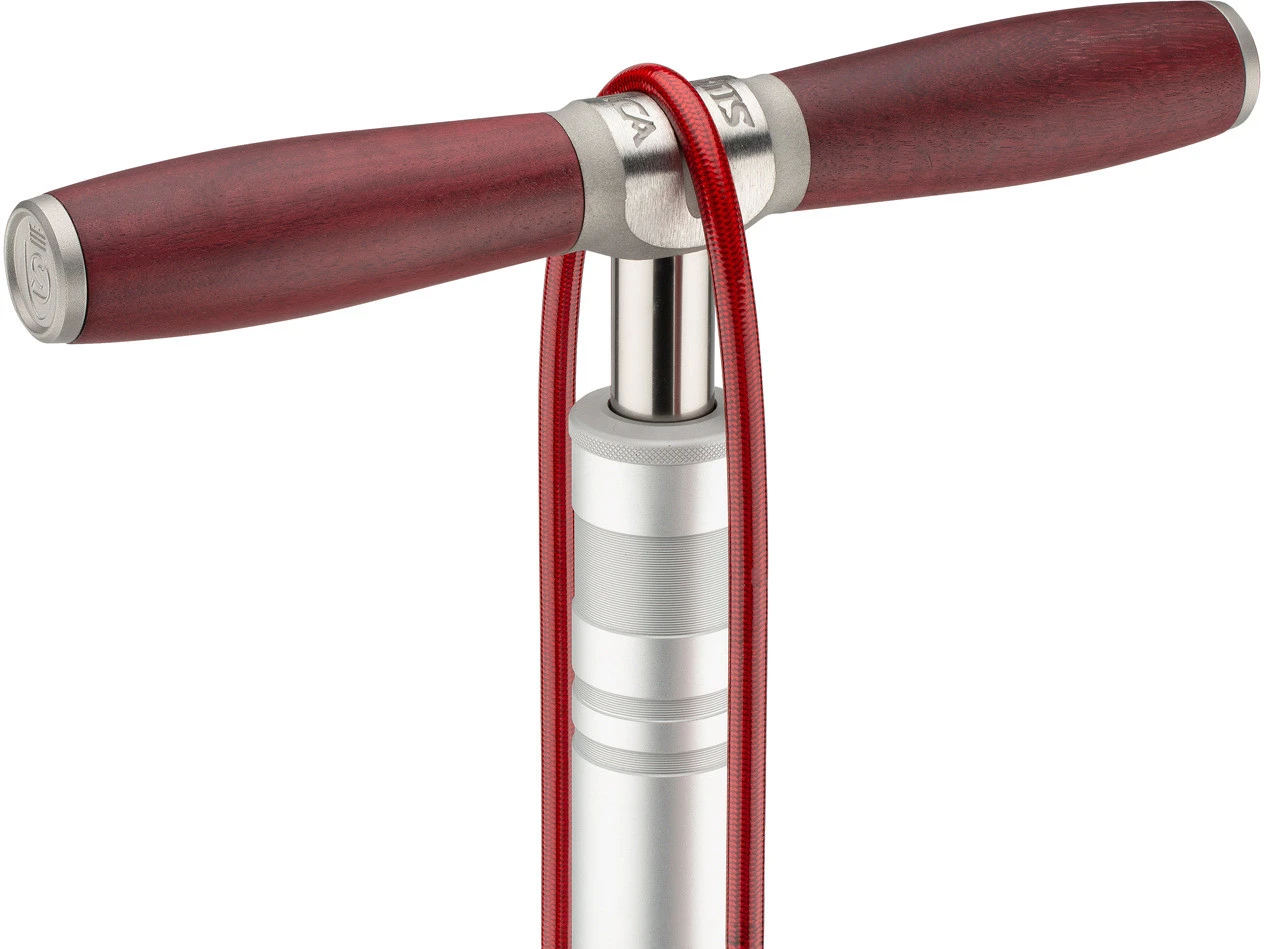 Especificaciones:Presión máx.:11 bar (160 psi)Cabezal de bomba:Válvula Sclaverand/Presta, válvula Auto/SchraderDatos técnicos:Medidas:71 cmManómetro:analógico, parte inferiorPuño:Mango en T de amarantoTubo de bebida:hasta 12.000 psi resistente a la presiónMaterial Cilindro:Aluminio (7005)Características:asa de amaranto (Purpleheart)manómetro mecánico de 0-160 psi con una precisión de 1 psi, probado y numerado individualmentemanguera resistente a la presión hasta 12.000 psi, desarrollada como línea de freno para coches de carrerascojinete lineal IGUS de primera clase y eje con revestimiento duro de PTFE de aluminio 7005sello único y duradero hecho de cuero, instalado por Silca en esta forma desde 1946otras juntas de Dupont Viton, también utilizadas en los relojes de buceo de alta calidadválvula antirretorno de latón macizo, procedente del mismo proveedor italiano desde 1946base pesada y extremadamente estable con pies de elastómero fabricados en Alemania, estables y sin arañazos en todo tipo de suelosMade in USAInformación de válvula:Válvula AV: