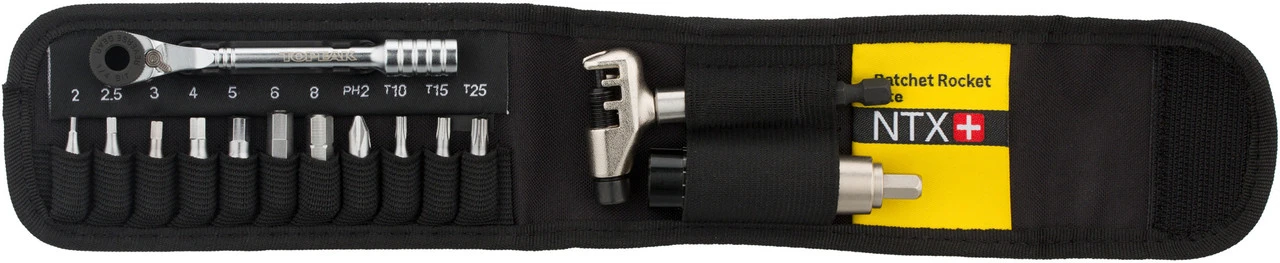 Con el mini juego de herramientas Ratchet Rocket Lite NTX+ de Topeak, tienes todo lo que necesitas para las reparaciones más frecuentes de bicicletas. La práctica bolsa de nailon contiene una carraca mini, una tronchacadenas, un accesorio de par de de giro de 2 a 6 Nm, un portapuntas magnético, así como puntas hexagonales, Torx y de estrella. Para facilitar la organización, los compartimientos de la bolsa están etiquetados con el tamaño de la punta correspondiente. En caso necesario, puedes guardar los parches en el compartimento por separado.