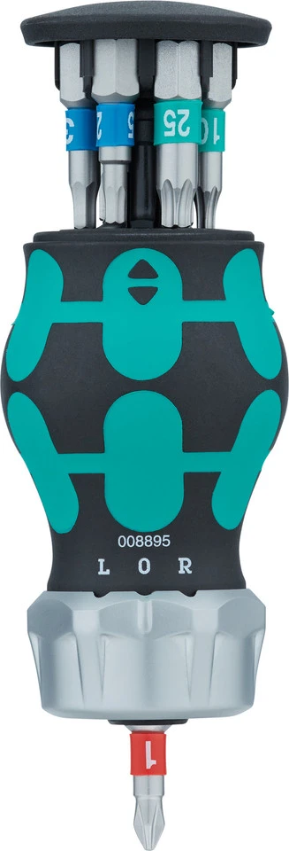 Especificaciones:Función:Herramientas para atornillarTipo de herramienta:DestornilladorModelo:llave hexagonal, Torx, estrellaFijación de herramienta:Hexágono 1/4″Datos técnicos:Material:Acero, plásticoCaracterísticas:un compacto juego de herramientas de atornillado de 8 piezas para aplicaciones de bicicleta, también portablesportapuntas extra pequeño para trabajar en lugares de difícil accesogunción de trinquete con bajo ángulo de recuperación gracias al dentado finopuntas de acero inoxidable endurecidas en hielo al vacíollave hexagonal: 2,5, 3, 4, 5 mmTorx: T10, T25Estrella: PH1ajuste seguro de las puntas gracias al portapuntas magnéticodepósito de puntas integrado en el mangoNúmero de fabricante:05004185001
