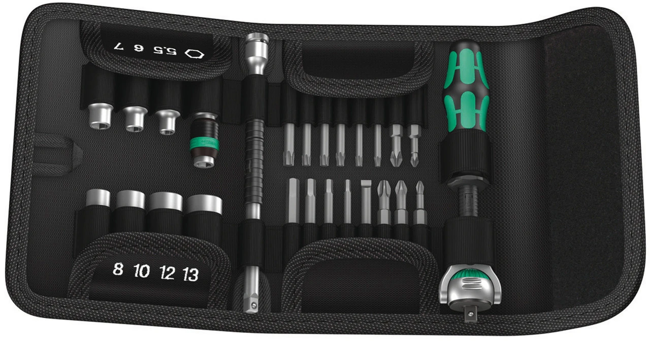Volumen de envío:1 x Carraca Wera Zyklop Speed 8000 A1 x Conector Zyklop Wera 8784 A1, 1/4″1 x Extensión Zyklop Wera 8794 LA con manguito de liberación rápida, largo, 1/4″3 x Bit Wera 851/4 TZ PH para tornillos de estrella Phillips-Recess (1/2/3 x 50)2 x Bit Wera 855/4 TZ PZ para tornillos Phillips-Pozidriv (1/2 x 50)6 x Bit Wera 867/4 Z TORX® para tornillos Torx (TX10 / TX15 / TX20 / TX25 / TX27 / TX30 x 50)4 x Bit Wera 840/4 Z Hex-Plus para tornillos hexagonales (3,0/4,0/5,0/6,0 x 50)1 x Bit Wera 800/4 Z para tornillos de cabeza ranurada (1,0 x 5,5 x 50)7 x Llaves de vaso Wera 8790 HMA para tornillos y tuercas hexagonales externas (5,5/6,0/7,0/8,0/10,0/12,0/13,0 x 23)