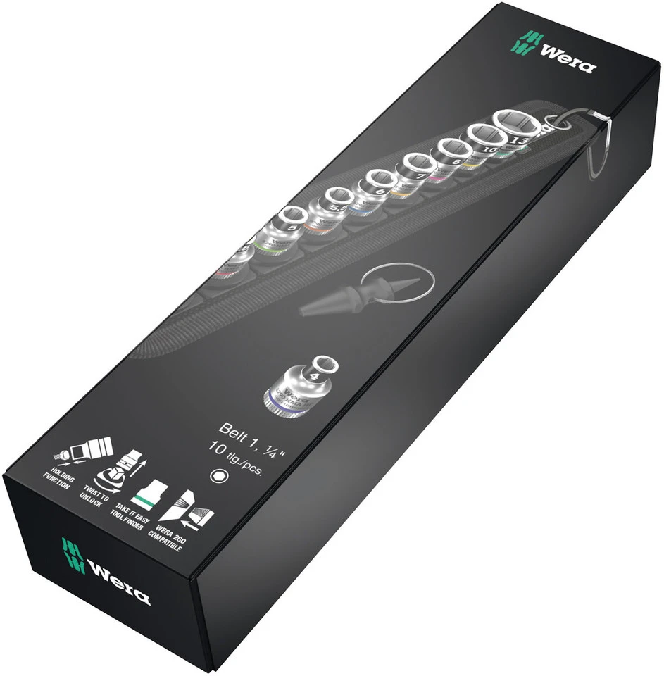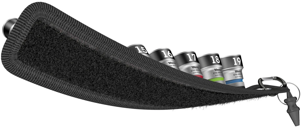 El juego de insertos imantados de llaves de vaso Belt A 1 Zyklop de Wera es un robusto cinturón textil para el práctico almacenamiento de 9 nueces. Estas permanecen en su sitio gracias a un mecanismo de rotación de funcionamiento suave, pero pueden ser removidas sin dificultad. El buscador de herramientas «Take it easy» con codificación de colores según el tamaño te ayuda a elegir la herramienta que necesitas. Con el mosquetón, el cinturón se puede fijar fácilmente a la trabilla o a una bolsa. Las nueces están equipadas con una función de imán. Esto facilita el atornillado y reduce el riesgo de pérdida del tornillo al introducir la pieza. La parte posterior de fieltro y la tira de velcro autoadhesiva están diseñadas para que se puedan fijar fácilmente a la pared, a un estante o al carro de taller.